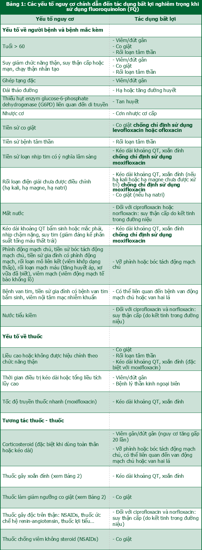 Nguy cơ gặp tác dụng bất lợi nghiêm trọng tăng lên khi có các yếu tố nguy cơ liên quan đến đặc điểm người bệnh và bệnh mắc kèm, cách dùng fluoroquinolon (liều và/hoặc thời gian dùng) và các thuốc phối hợp. Các yếu tố nguy cơ này được tóm tắt trong Bảng 1.