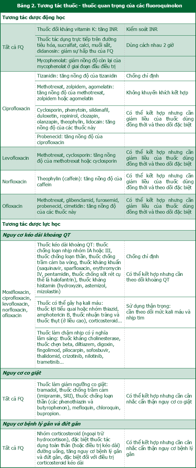 Nguy cơ về tương tác thuốc với FQ có thể xảy ra theo 2 cơ chế: dược động học (khi FQ làm thay đổi nồng độ của các thuốc khác) và dược lực học (khi tác dụng bất lợi do FQ được khuếch đại về tần suất hoặc cường độ bởi việc phối hợp với thuốc khác). Tương tác dược động học hầu hết chỉ xảy ra với ciprofloxacin là một thuốc ức chế enzyme P450 1A2 và chất vận chuyển OAT1/3 ở ống thận dẫn đến khả năng làm tăng nồng độ của thuốc khác. Các tương tác dược lực học quan trọng bao gồm nguy cơ kéo dài khoảng QT, co giật và bệnh lý gân/đứt gân. Thông tin về các tương tác thuốc - thuốc trên được tổng hợp ở Bảng 2.