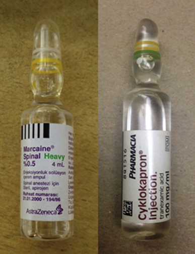 Việc sử dụng TXA ngày càng phổ biến trong phòng mổ để kiểm soát băng huyết khi mổ lấy thai dường như đi kèm với sự gia tăng các trường hợp tiêm nhầm thuốc vào trục thần kinh (tiêm tủy sống hoặc tiêm ngoài màng cứng). Các ống thuốc acid tranexamic thường có mặt trên xe thuốc gây mê trong phòng mổ, làm tăng nguy cơ nhầm lẫn với thuốc gây tê tủy sống, kỹ thuật viên có thể vô tình tiêm thuốc vào đường tủy trước phẫu thuật. Nguy cơ sai sót còn cao hơn do hình dạng và kích thước tương tự nhau giữa ống chứa acid tranexamic và ống chứa các thuốc gây tê tủy sống. Trong ca lâm sàng trên, kỹ thuật viên đã tiêm nhầm acid tranexamic thay vì bupivacain để gây tê tủy sống, dẫn đến bệnh nhân gặp tình trạng co giật kháng trị. Nguyên nhân chính của sai sót này bao gồm lỗi con người và việc hai ống thuốc có kích thước, màu sắc tương tự nhau (Hình 1).
