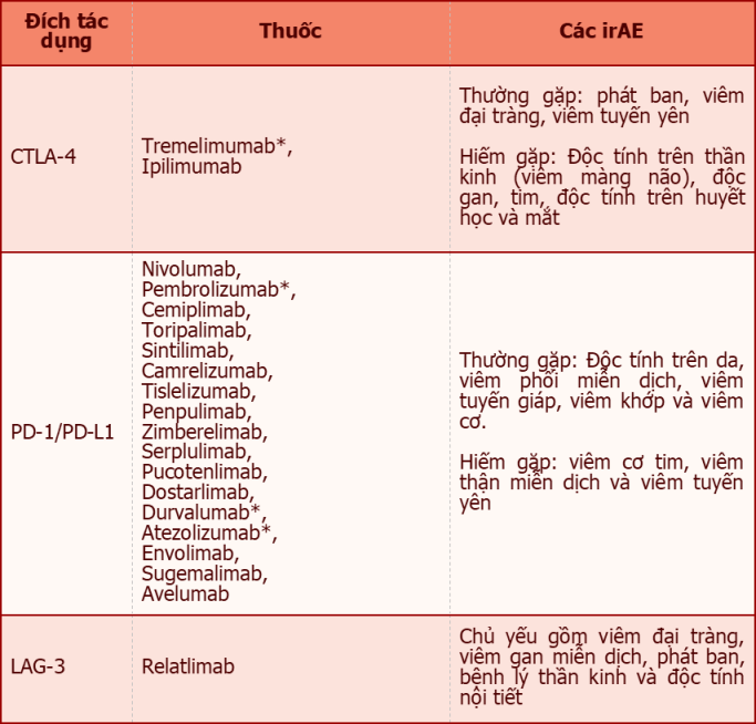 Nguy cơ xuất hiện các irAE có sự khác biệt giữa các nhóm thuốc. Thuốc ức chế CTLA-4 thường gây viêm đại tràng, viêm tuyến yên và ban da; trong khi đó thuốc ức chế PD-1/PD-L1 thường liên quan đến viêm phổi và rối loạn chức năng tuyến giáp. Khi phối hợp CTLA-4 với PD-1/PD-L1, các biến cố thường gặp nhất là trên da và nội tiết, tiêu chảy và viêm đại tràng qua trung gian miễn dịch. Các irAE đặc hiệu theo từng đích của ICI được trình bày tóm tắt trong Bảng 1.