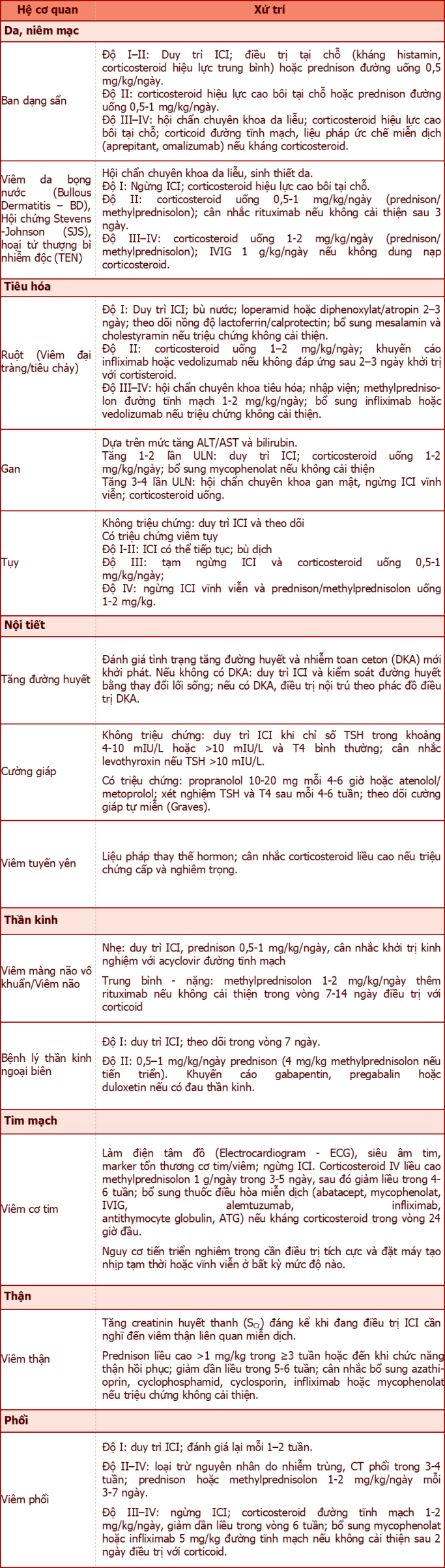 - Độ III: Ngừng điều trị và bắt đầu corticosteroid liều cao (prednisone 1-2 mg/kg/ngày hoặc tương đương) và giảm liều dần trong 4–6 tuần; nếu triệu chứng không cải thiện trong vòng 2–3 ngày, cân nhắc bổ sung thuốc điều hòa miễn dịch như infliximab, rituximab hoặc tocilizumab. Cân nhắc tái điều trị với phác đồ đơn trị liệu các ICI có đích tác dụng trên PD-1/PD-L1 khi triệu chứng và/hoặc xét nghiệm của bệnh nhân cải thiện về ngưỡng mức độ I.