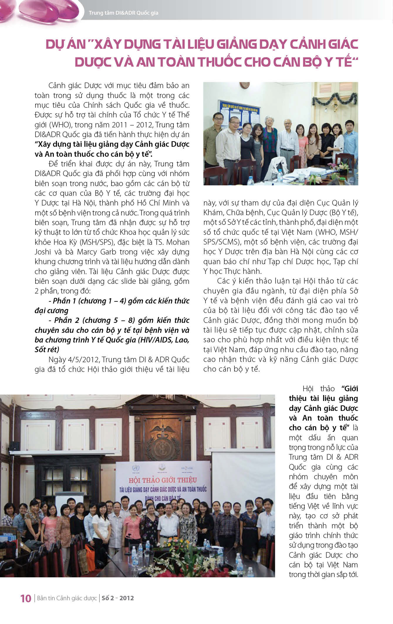 Ngày 4/5/2012, Trung tâm DI & ADR Quốc gia đã tổ chức Hội thảo giới thiệu về tài liệu này, với sự tham dự của đại diện Cục Quản lý Khám, Chữa bệnh, Cục Quản lý Dược (Bộ Y tế), một số Sở Y tế các tỉnh, thành phố, đại diện một số tổ chức quốc tế tại Việt Nam (WHO, MSH/SPS/SCMS), một số bệnh viện, các trường đại học Y Dược trên địa bàn Hà Nội cùng các cơ quan báo chí như Tạp chí Dược học, Tạp chí Y học Thực hành.